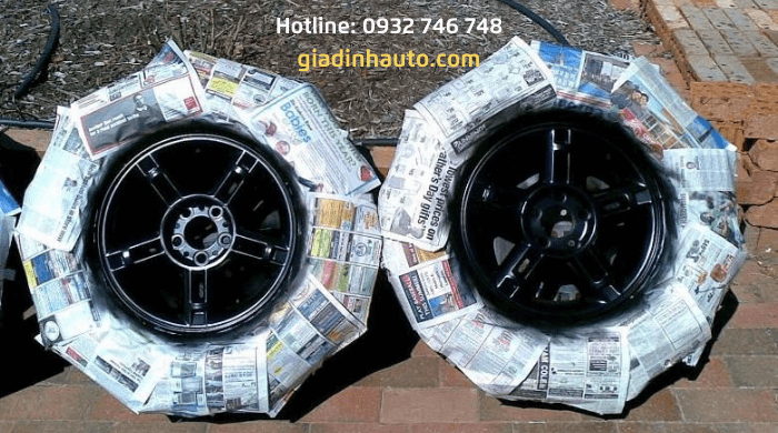 Bước 3: Nếu không có công cụ tháo vành xe ra ngoài, bạn hãy che chắn kỹ các chi tiết lốp xung quanh để tránh bị lem sơn. Sử dụng băng dính, giấy báo, nilong hoặc các vật liệu che phủ đã chuẩn bị bên trên.